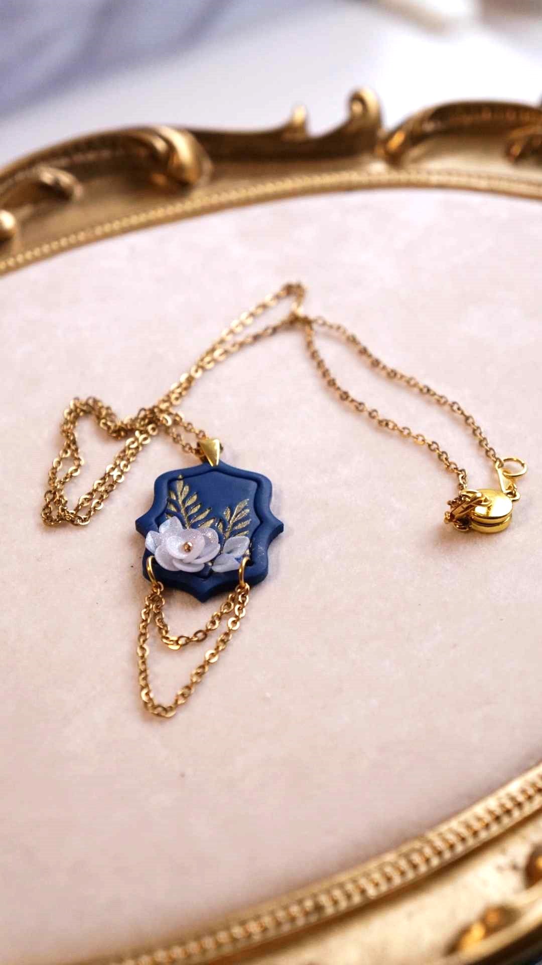 A piece that feels like poetry in jewelry form—this handcrafted pendant features a deep navy backdrop adorned with delicate white florals and hand-painted golden leaves. The scalloped frame design adds a touch of vintage elegance, while layered gold chains create graceful movement and depth.