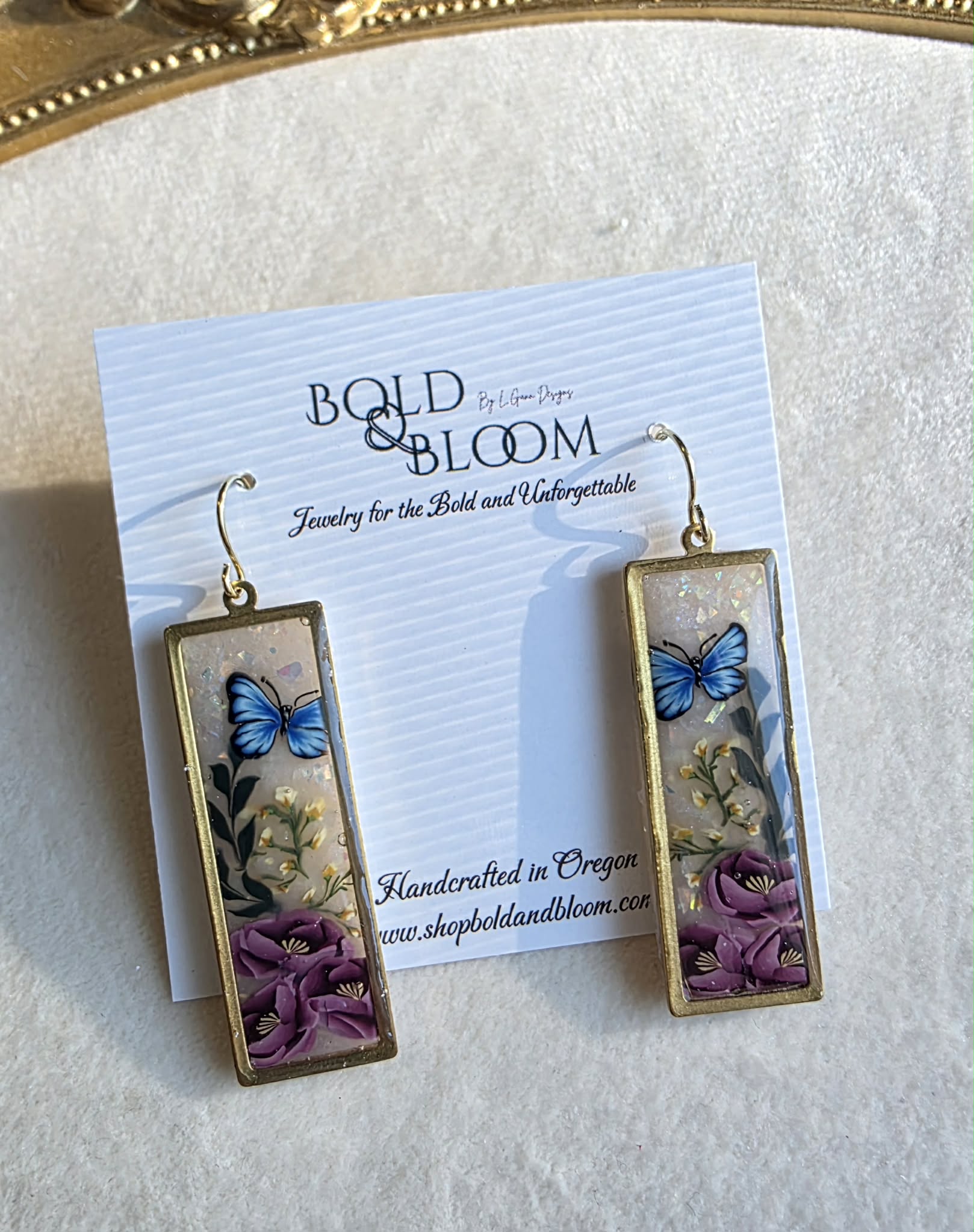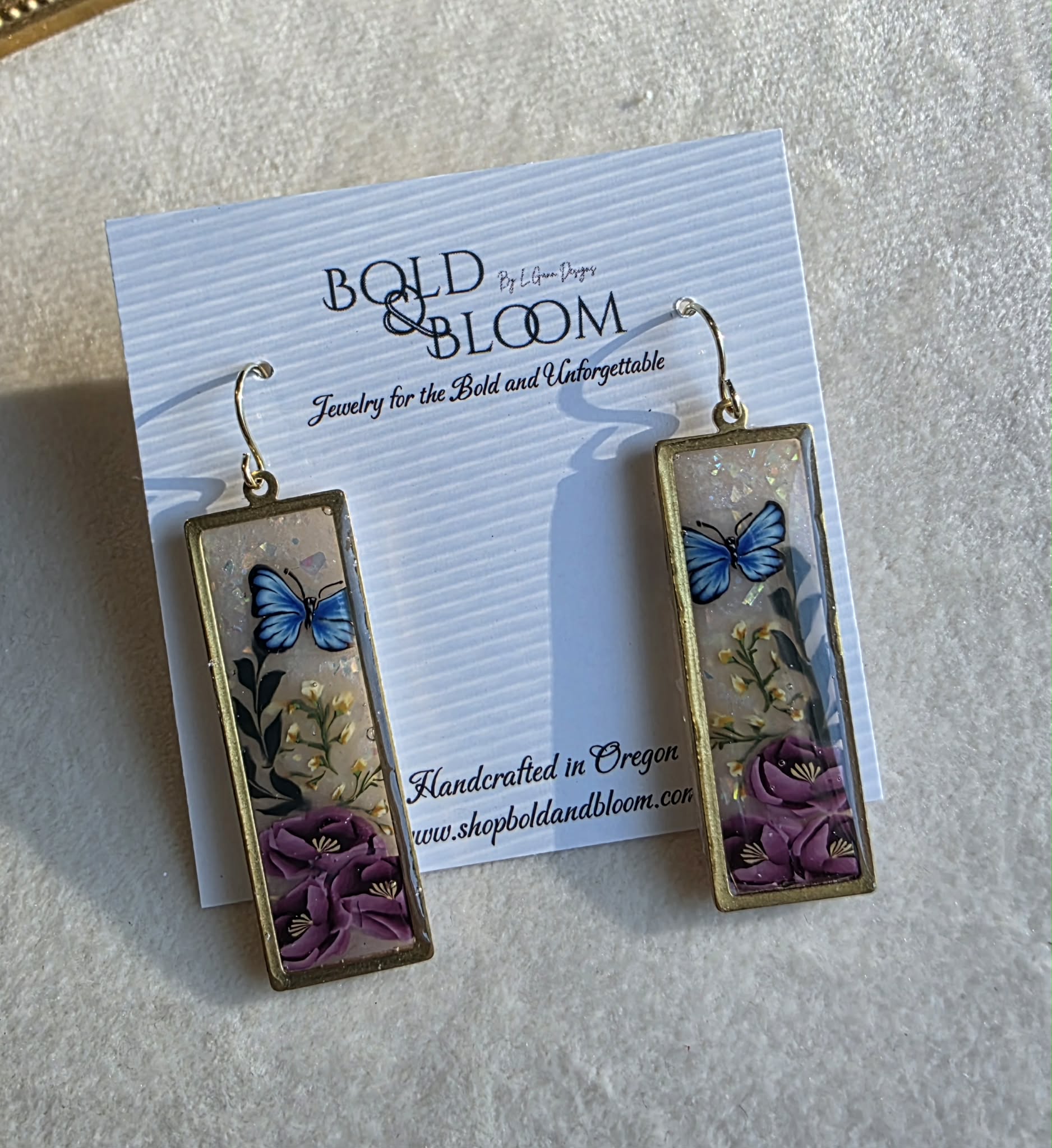 Elegant and softly expressive, the Butterfly Heirloom Dangle Earrings feature a slender, elongated silhouette showcasing a delicate blue butterfly floating above sculpted florals in muted plum and mauve tones. Set against a warm, luminous backdrop, the design feels like a preserved botanical vignette captured in motion.