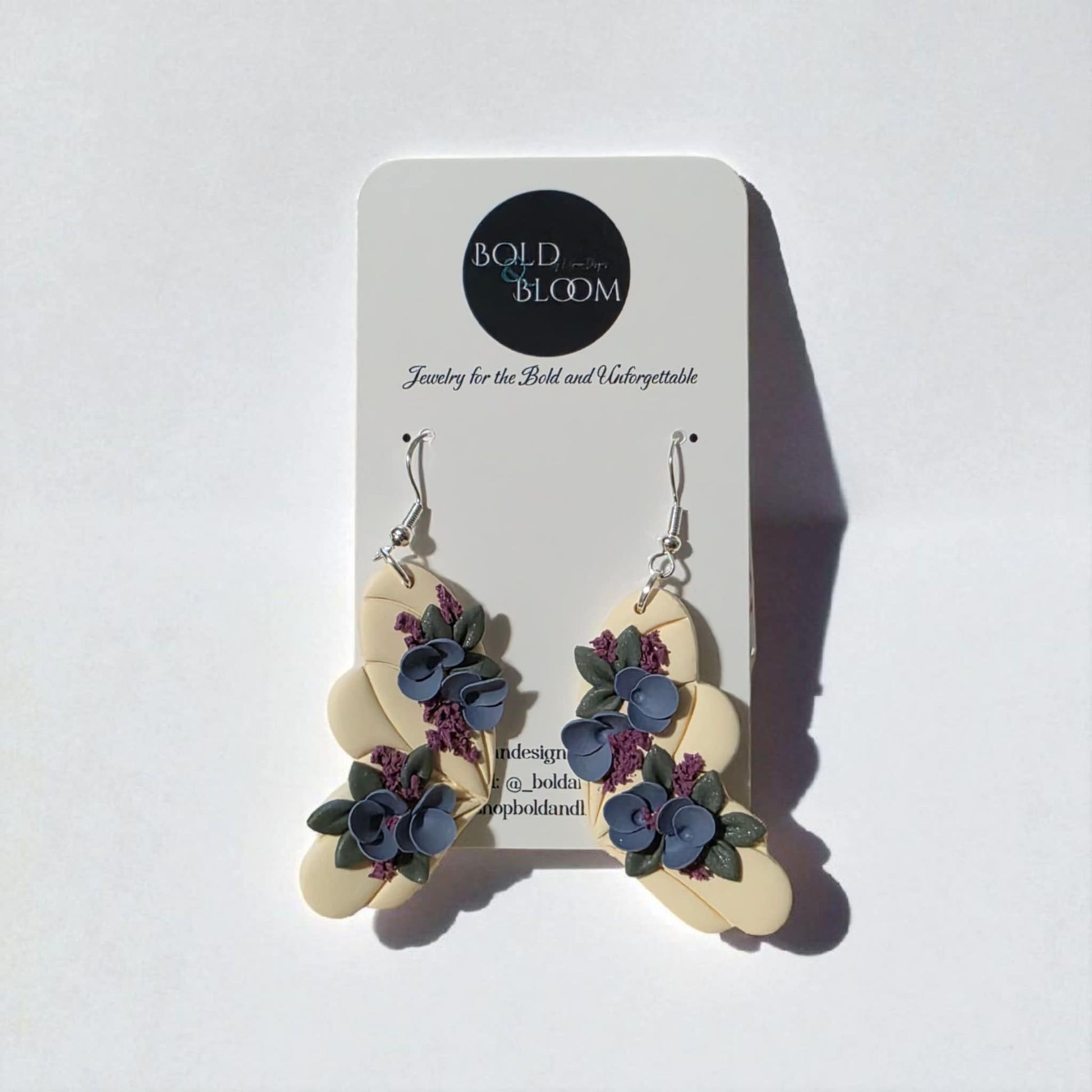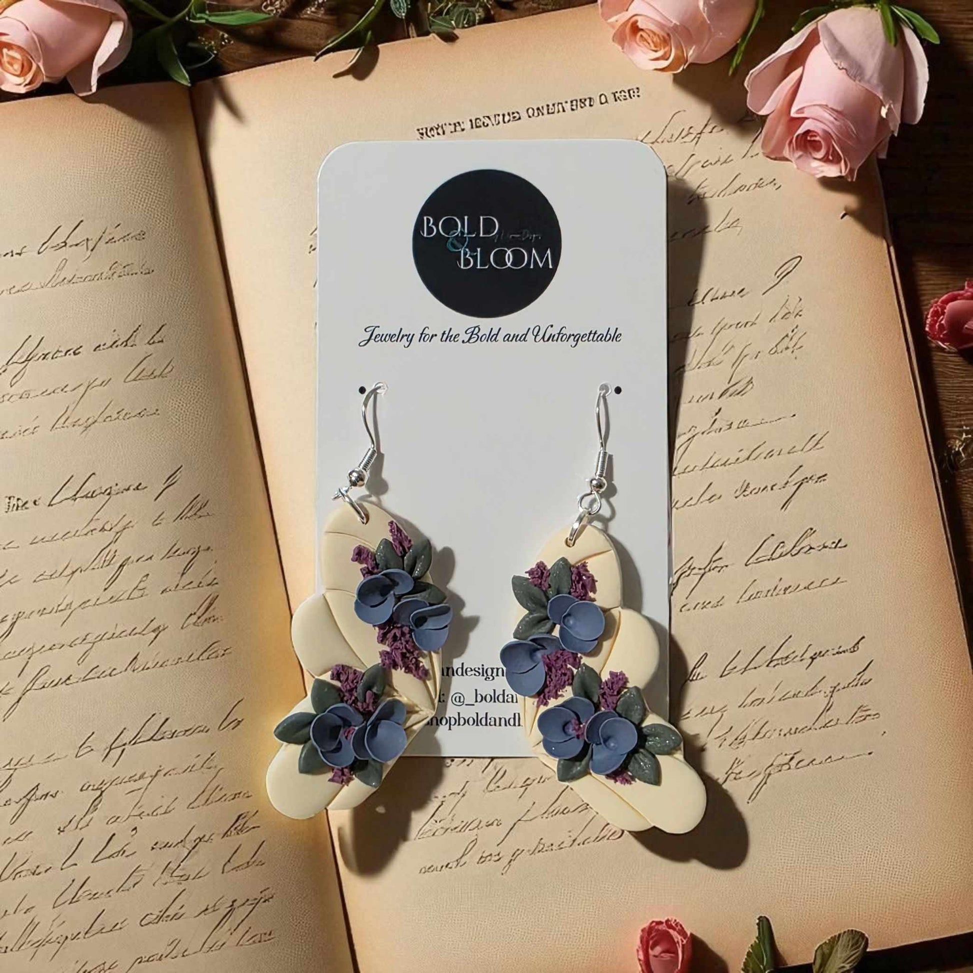 These handcrafted polymer clay earrings feature creamy butterfly wing shapes adorned with delicate blue blossoms, rich purple floral accents, and soft green leaves. Every petal and leaf is individually sculpted by hand, creating a unique, nature-inspired statement piece that blends elegance with a touch of whimsy.