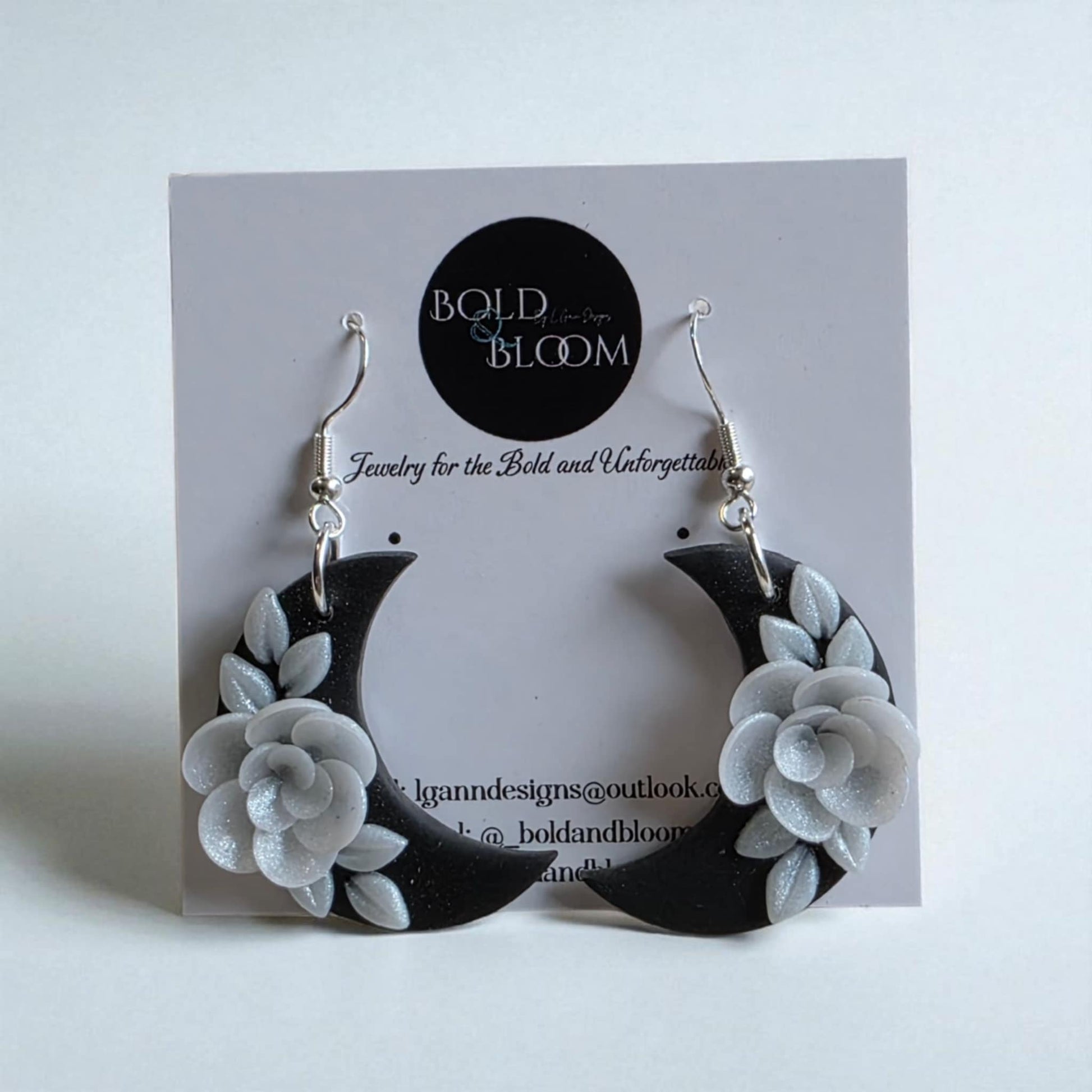 The Lunar Blossom Earrings are a perfect blend of celestial mystery and timeless elegance. Sculpted in a dramatic black crescent moon shape, each earring blooms with a silvery-white flower and shimmering leaves that catch the light like stardust. Bold yet graceful, these lightweight statement earrings bring a touch of lunar magic to both everyday wear and special occasions. Available with silver or gold findings for your perfect finish.