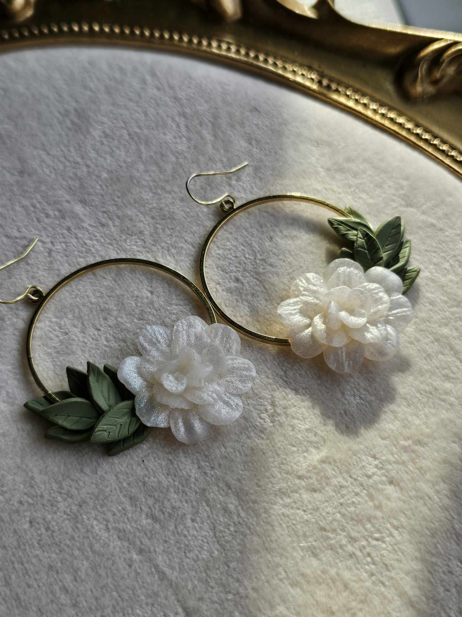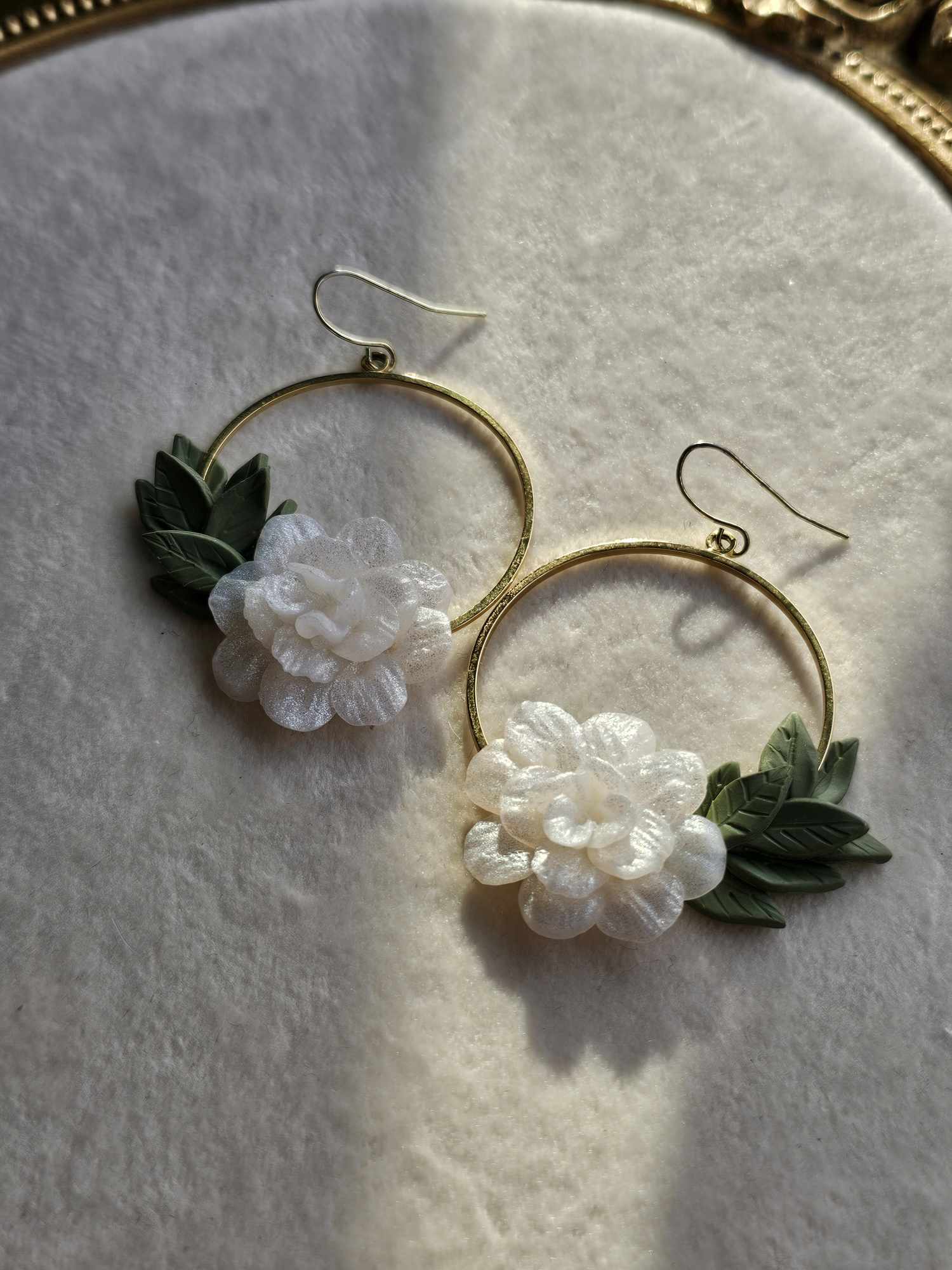 Gentle as the first morning sun, First Light captures the purity and promise of a new day. These golden hoops cradle a radiant white bloom, hand-sculpted from shimmering clay, and paired with soft sage leaves for a fresh, grounded feel. Lightweight yet impactful, they add a touch of lightness and quiet beauty to any look—perfect for celebrating new beginnings, spring weddings, or everyday grace.