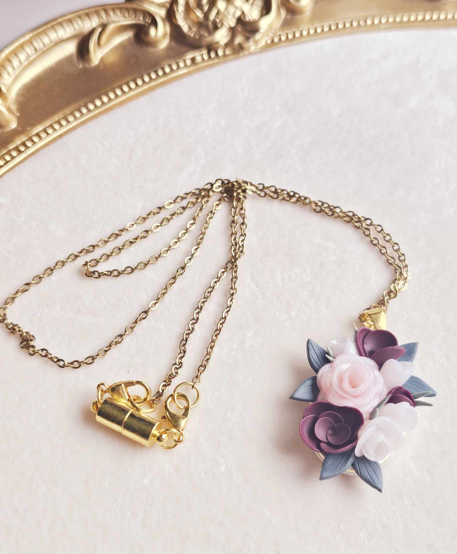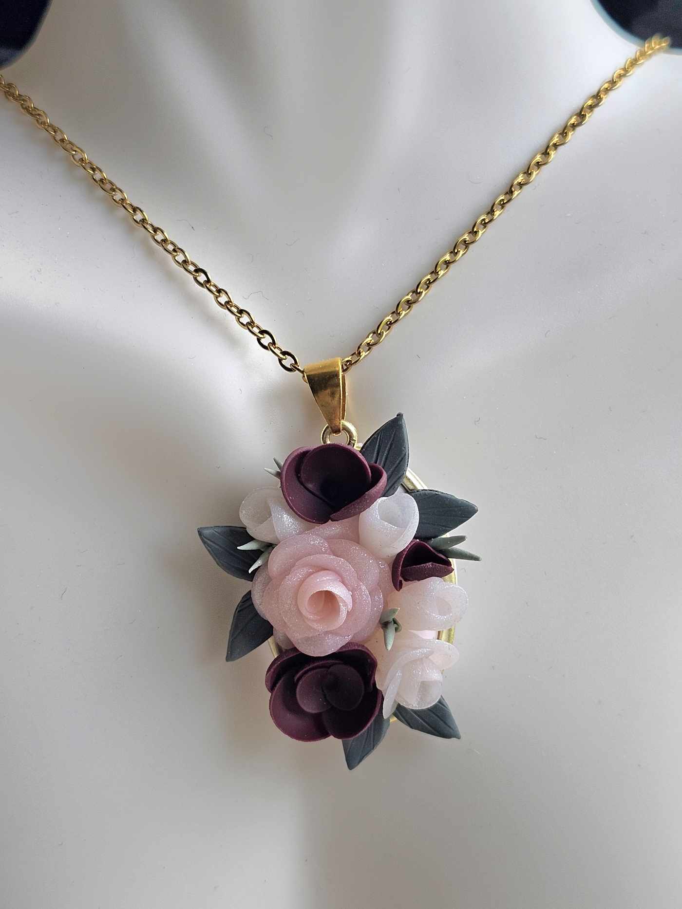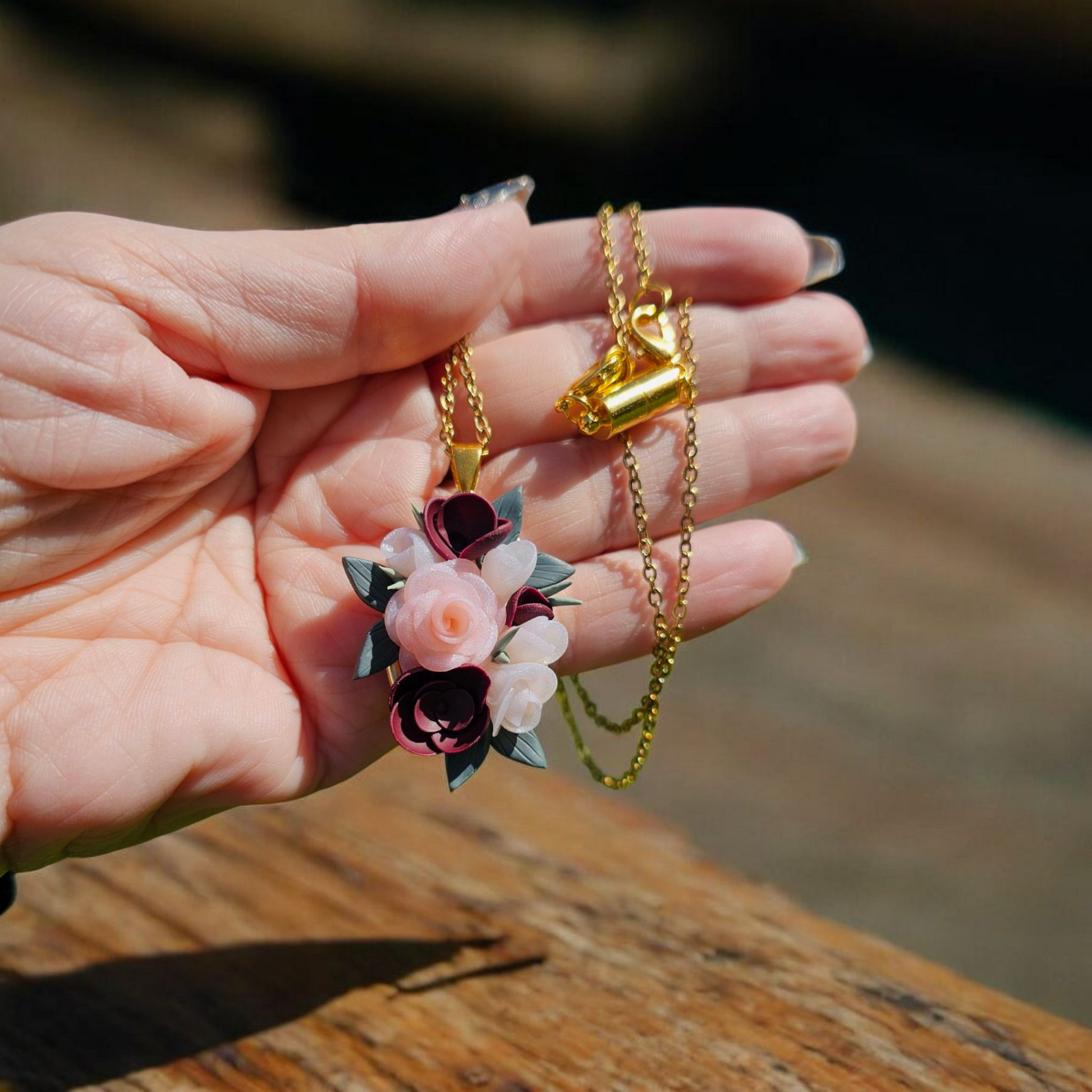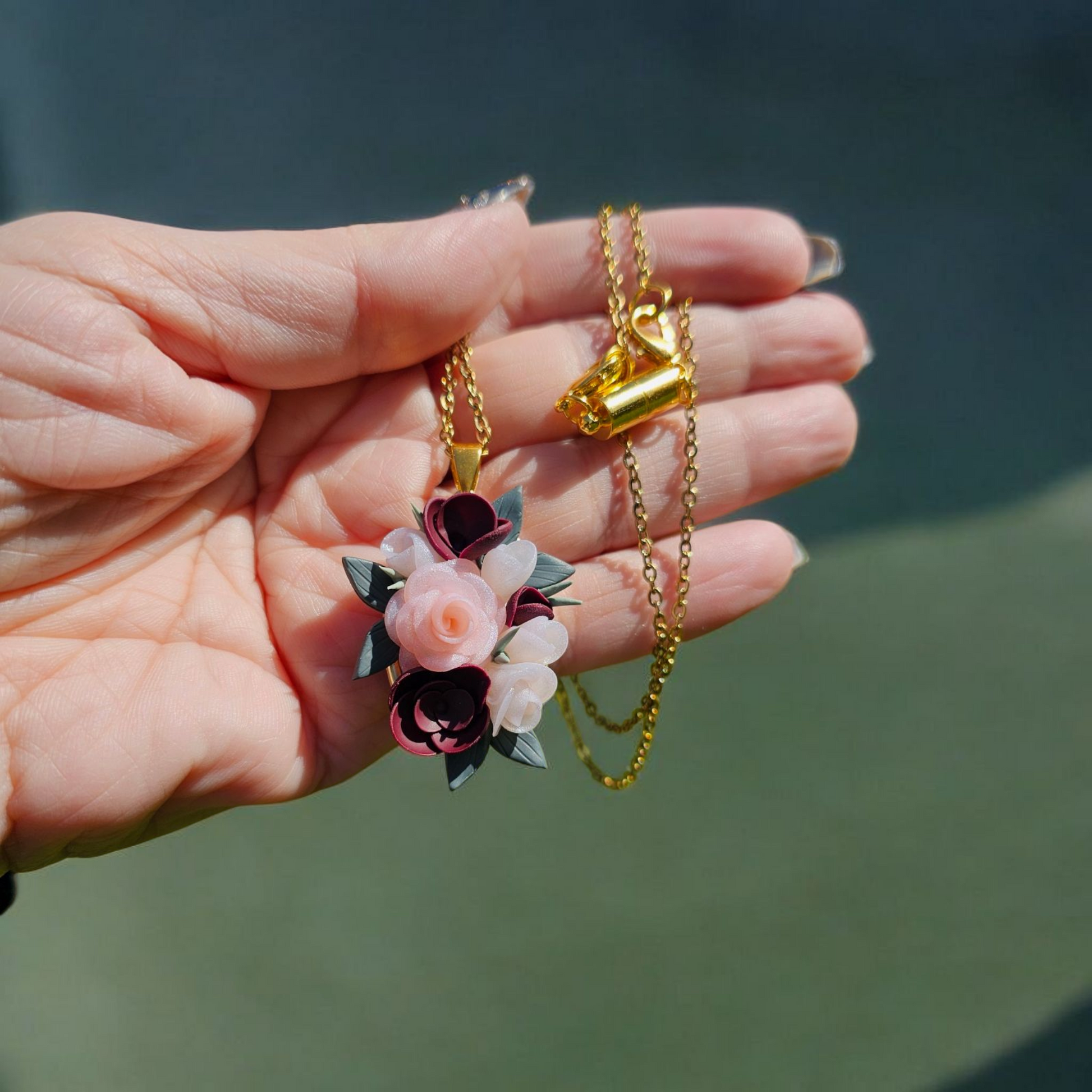 This handcrafted pendant is a blooming bouquet of strength—featuring a trio of deep burgundy roses, shimmering blush pink florals, and moody sage leaves. Each petal is sculpted by hand from polymer clay and arranged with intention, creating a layered, luxe look suspended from a radiant gold-tone chain.