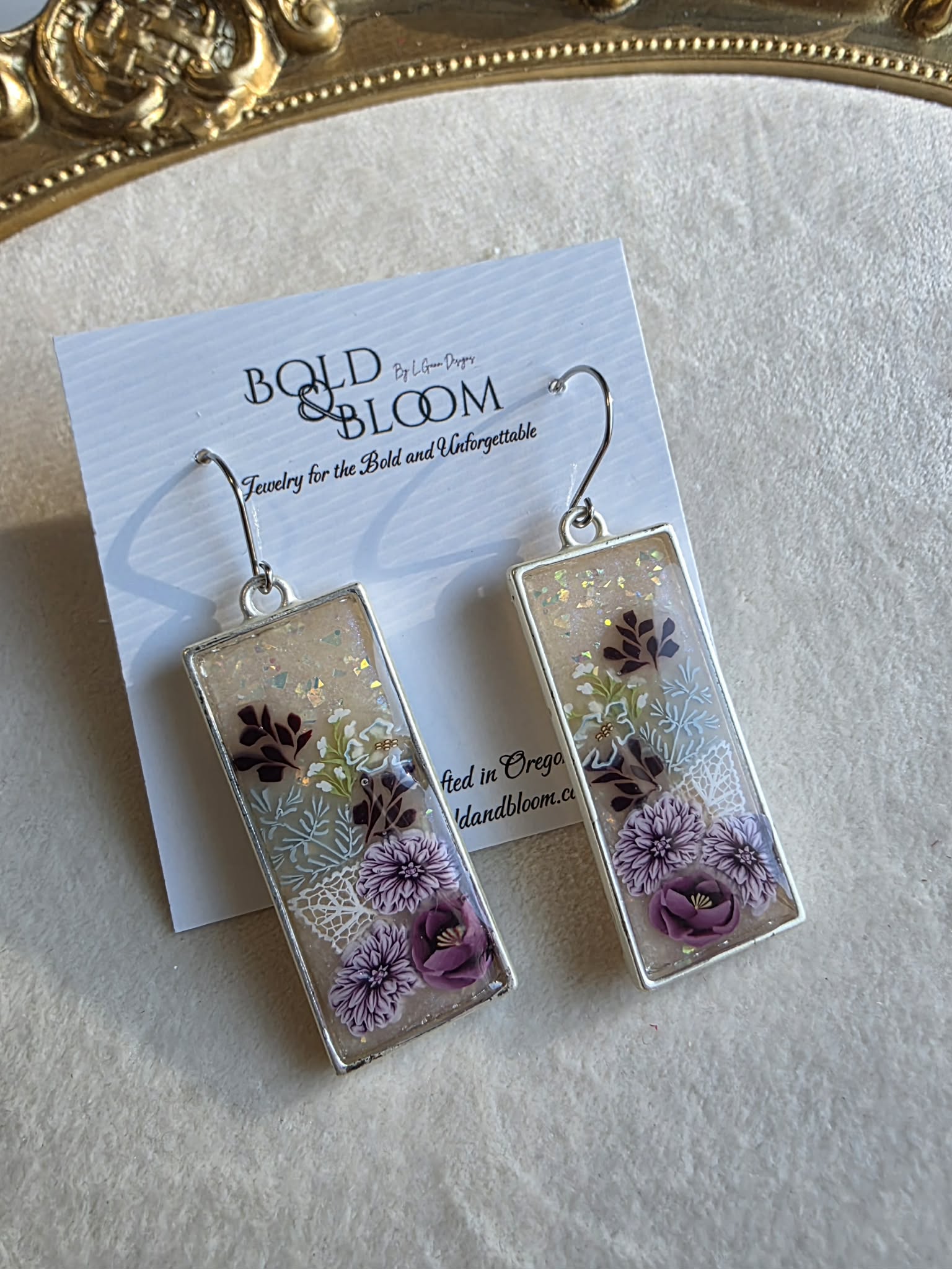 Bold yet timeless, the Silver Heirloom Garden Statement Earrings showcase an elongated botanical composition in rich plum, mauve, and golden tones, layered against a luminous, softly speckled background. The vertical format allows the florals to unfold like a pressed garden panel, framed in a refined Silver-tone rectangular bezel that evokes antique heirlooms and vintage keepsakes.