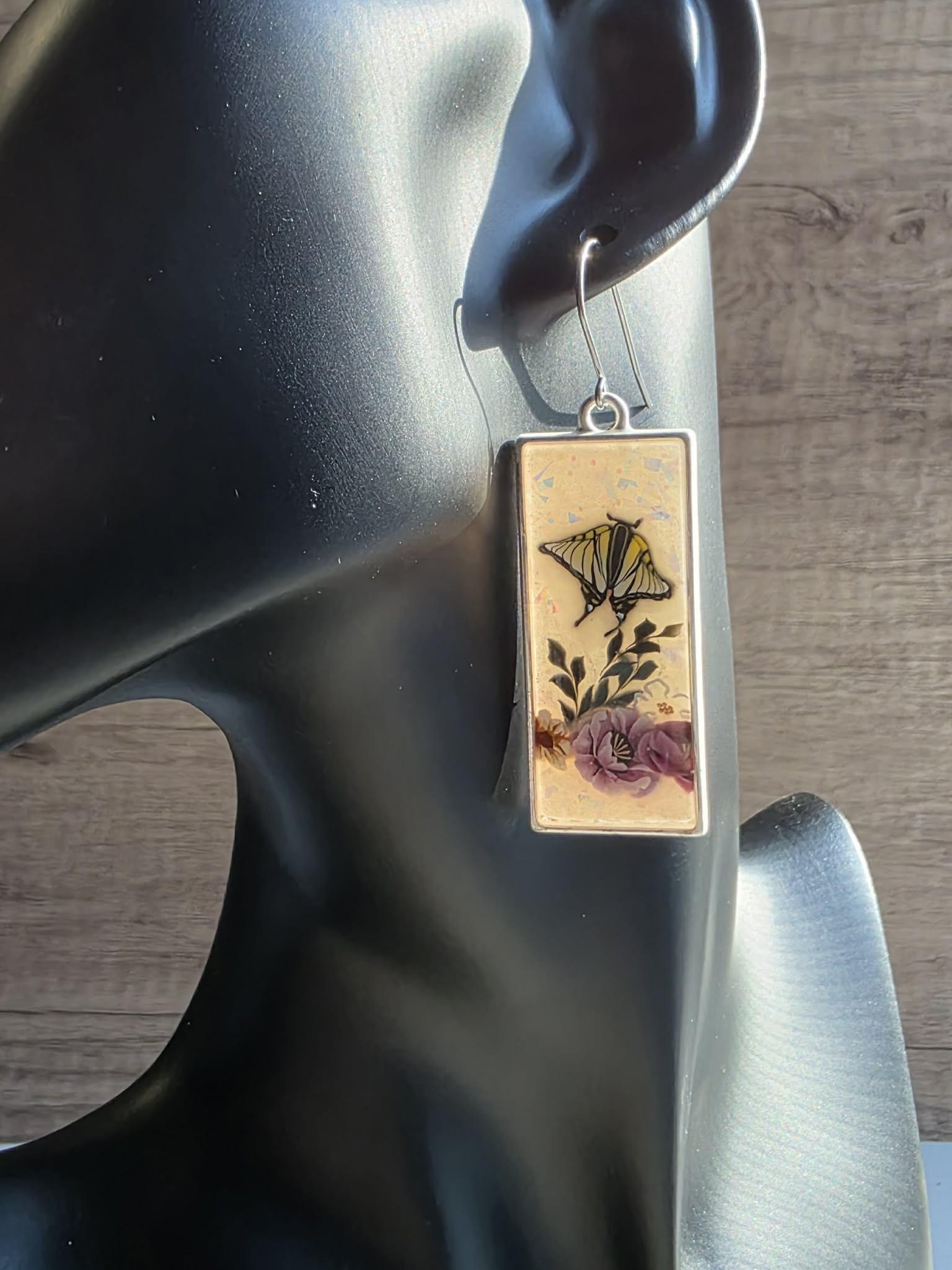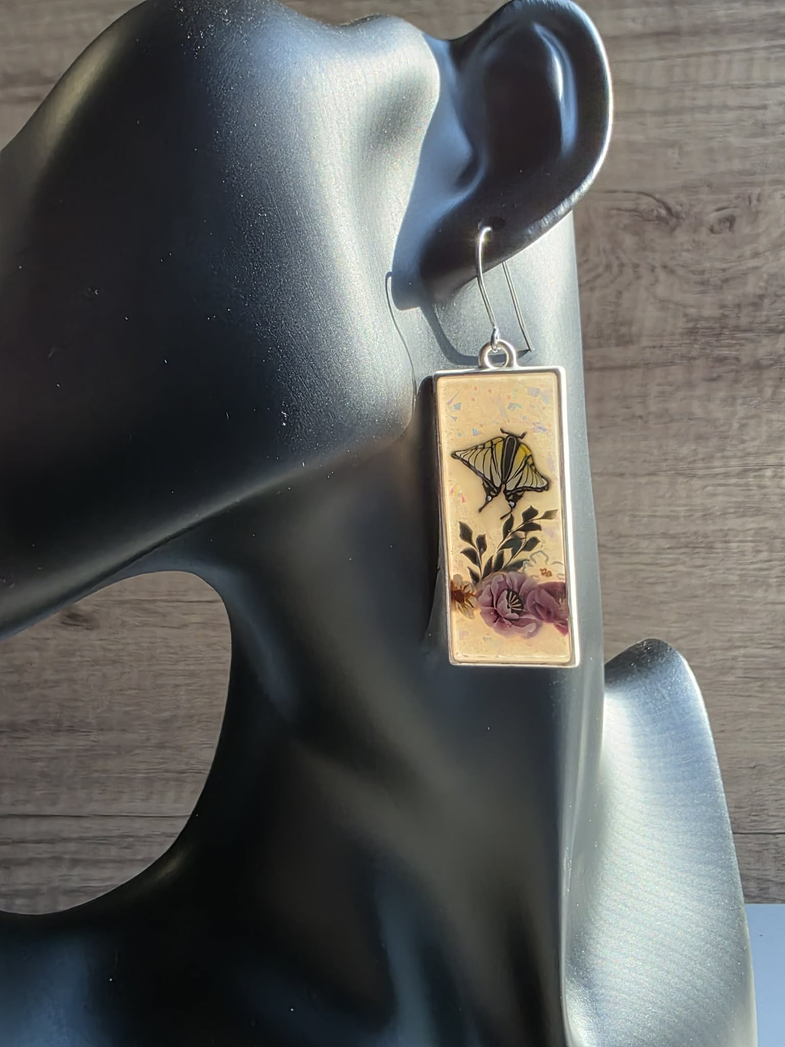 Romantic and richly detailed, the Heirloom Butterfly Garden Earrings feature a full botanical composition anchored by a delicate butterfly in flight. Sculpted florals in deep plum and mauve tones bloom against a warm, luminous backdrop, creating the feeling of a preserved garden vignette framed like an heirloom keepsake.