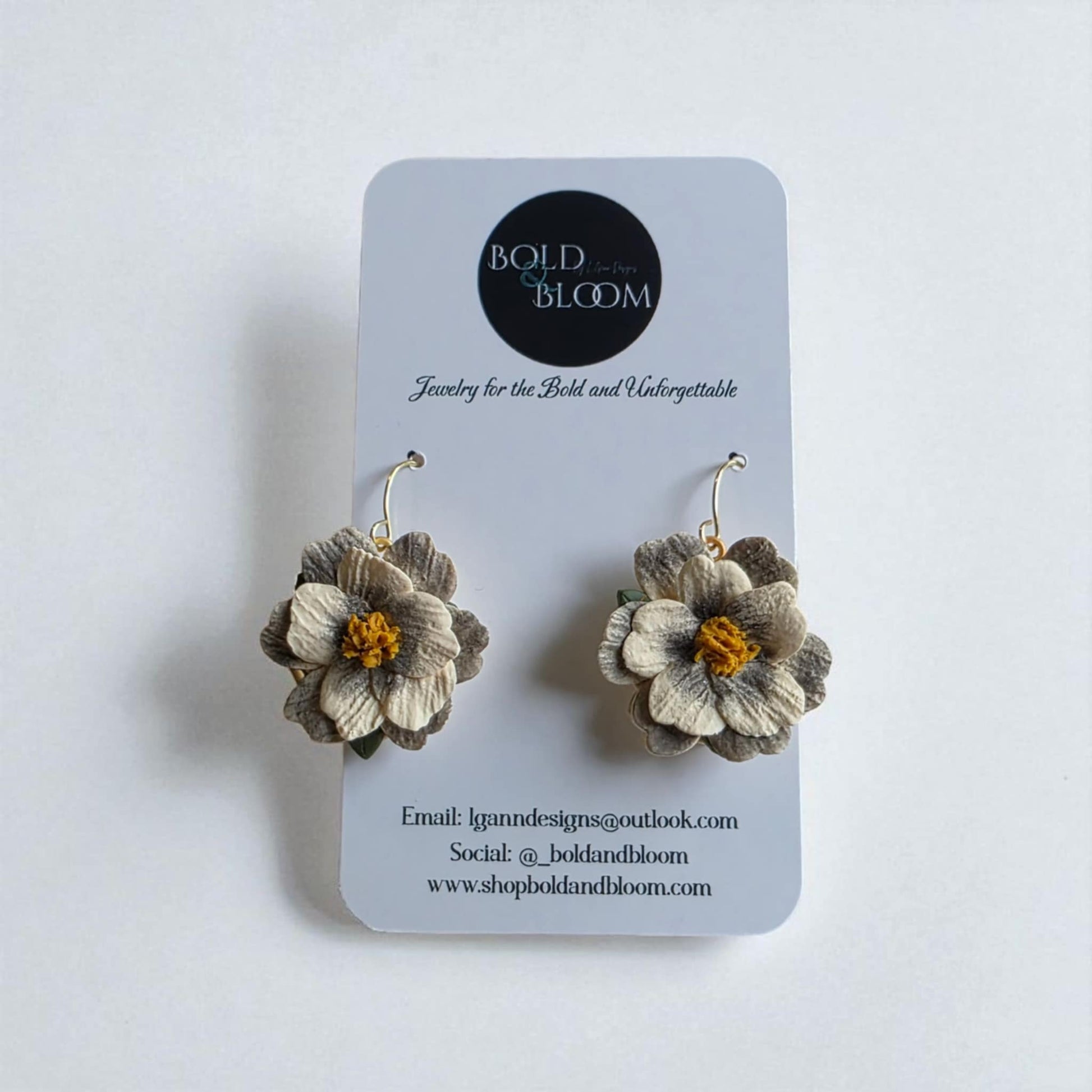 Handcrafted with lifelike petals and a golden floral center, each pair of our Bloom Earrings is a wearable work of art. Lightweight, hypoallergenic, and bold without being heavy, these earrings are designed to let your confidence bloom—whether styled casually or dressed up.