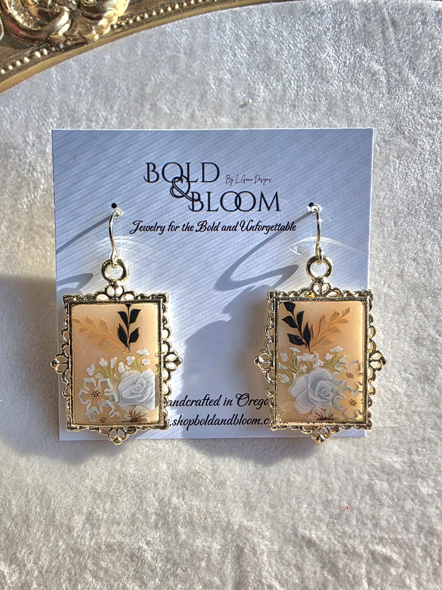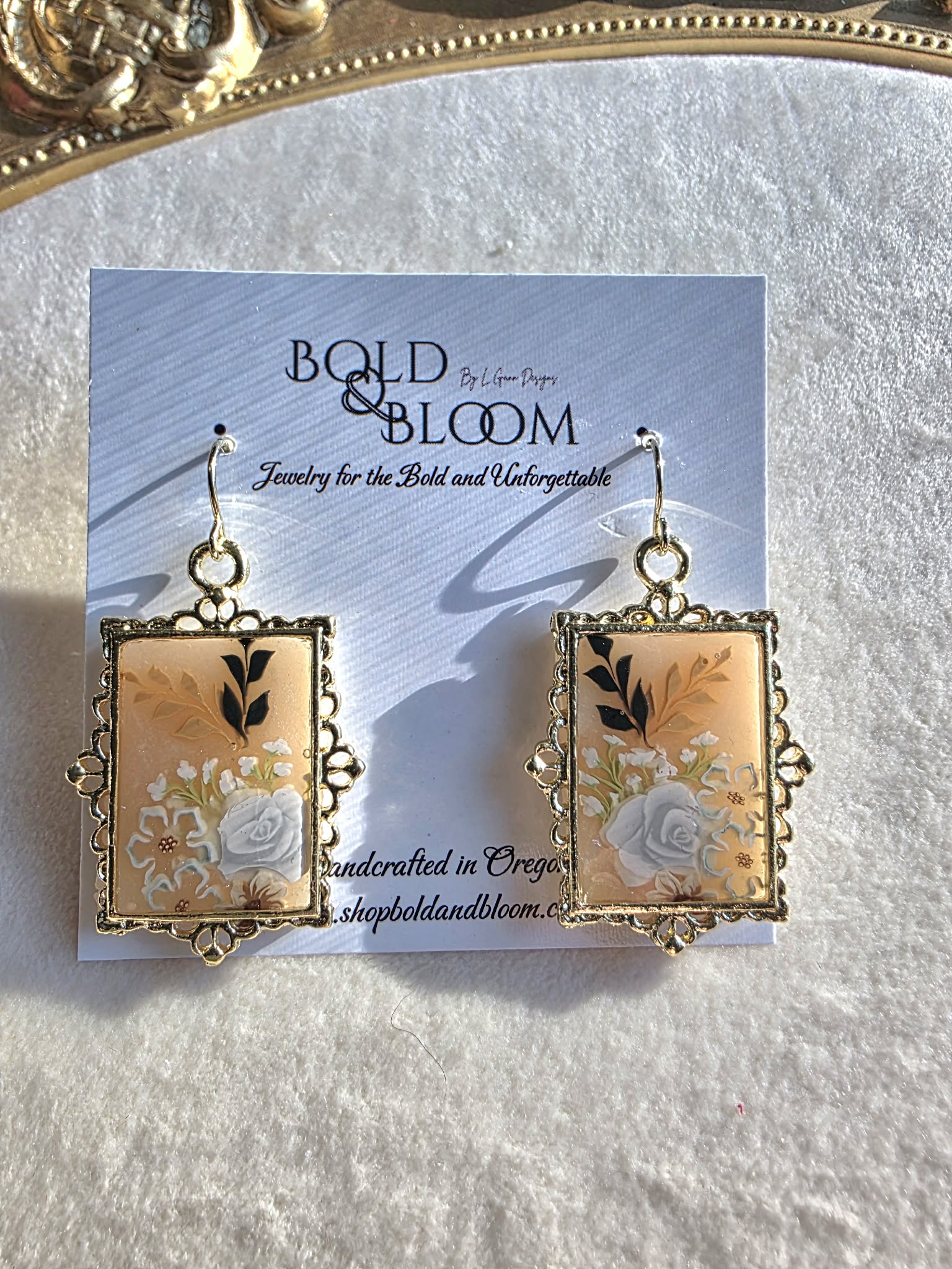 Soft and timeless, the Ivory Keepsake Rose Earrings feel like a miniature heirloom brought to life. A sculpted ivory rose anchors the design, surrounded by delicate botanical details and subtle shimmer, all framed within an ornate gold-tone bezel inspired by antique portrait frames and vintage keepsakes.
