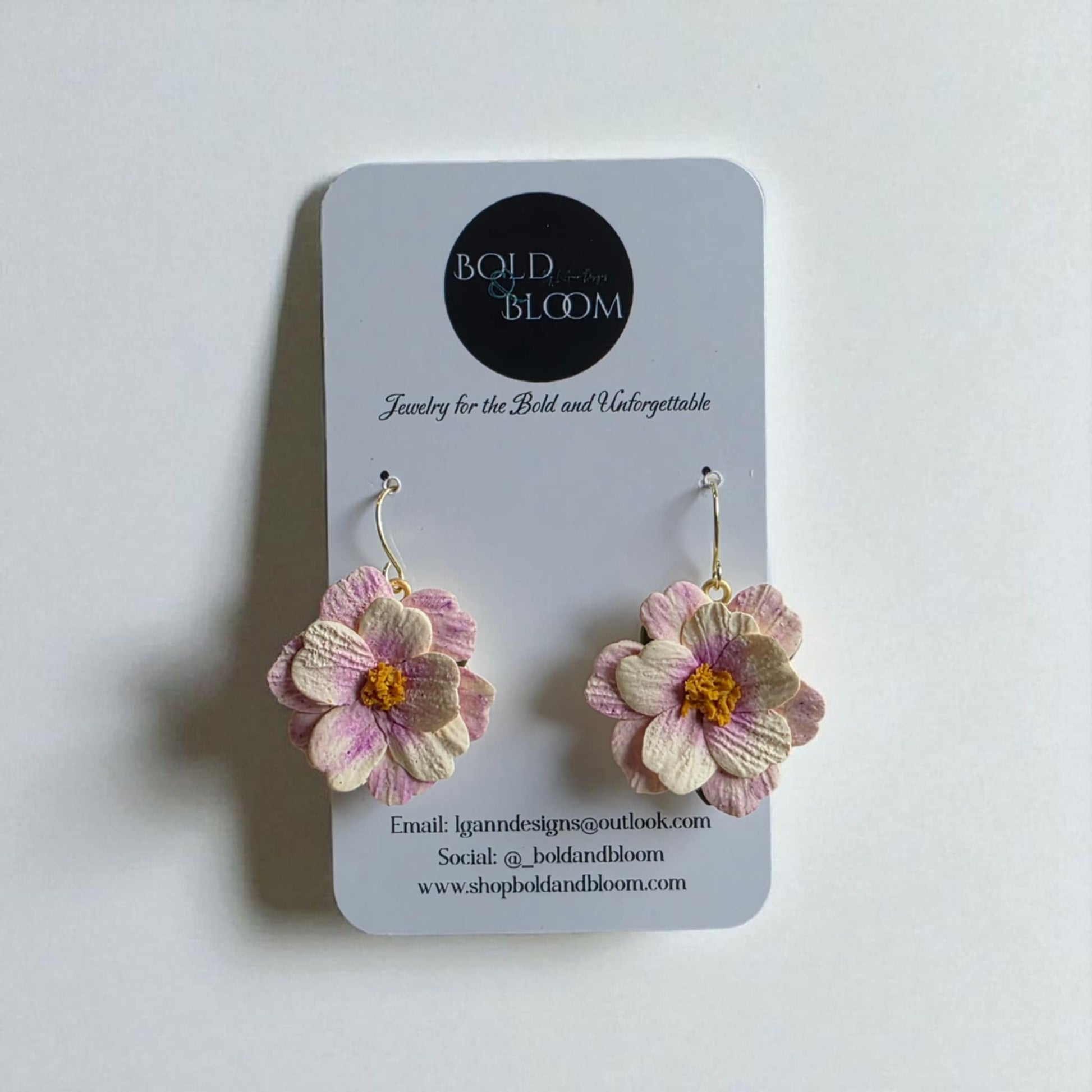Handcrafted with lifelike petals and a golden floral center, each pair of our Bloom Earrings is a wearable work of art. Lightweight, hypoallergenic, and bold without being heavy, these earrings are designed to let your confidence bloom—whether styled casually or dressed up.