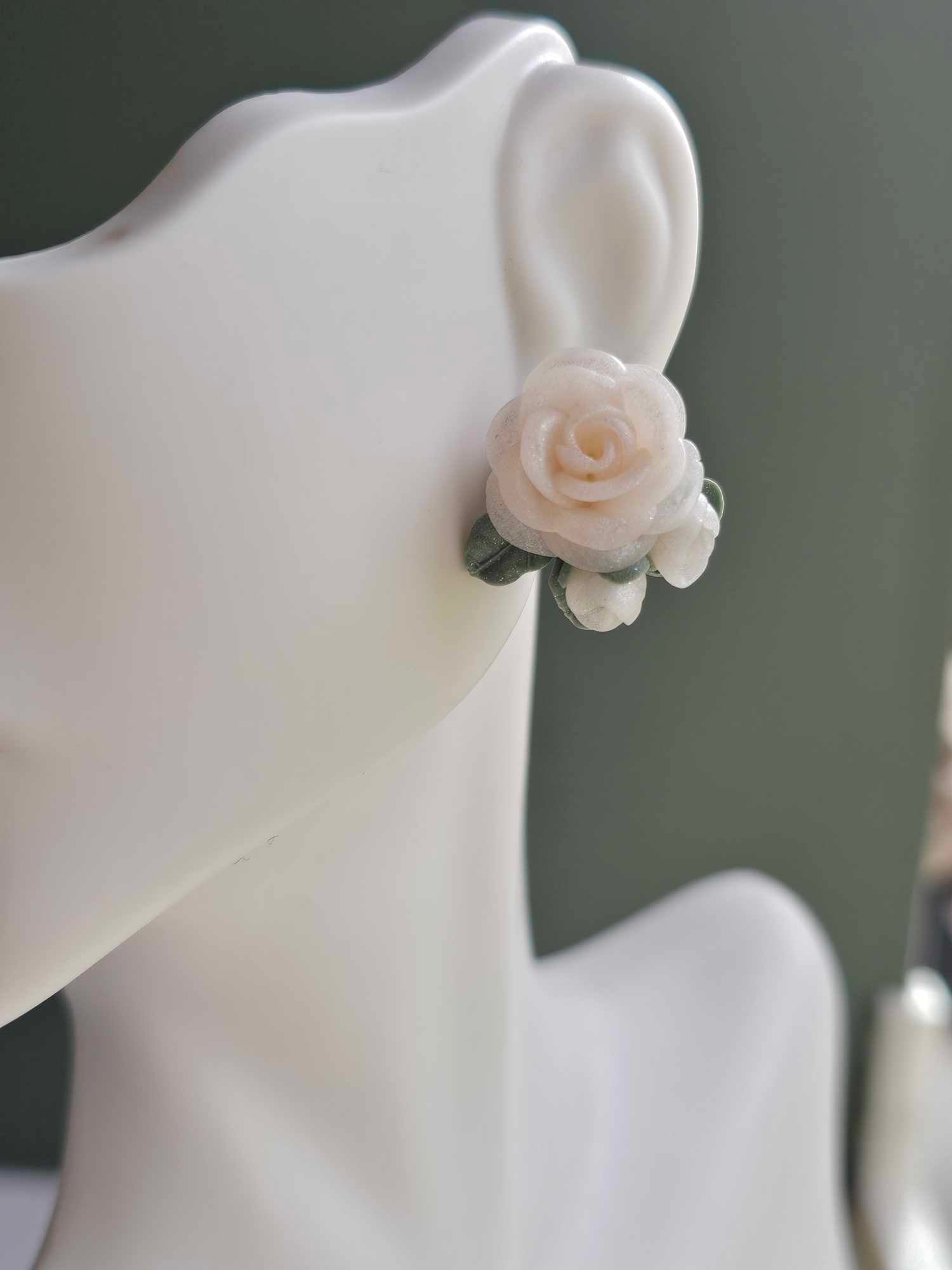 Made from lightweight polymer clay the timeless and romantic, Ivory Bloom Studs feature a handcrafted clay rose with soft, pearlescent petals and delicate buds nestled in matte sage leaves. These floral studs are lightweight and feminine with just the right amount of edge—perfect for everyday elegance or dressing up your leather jacket moment.