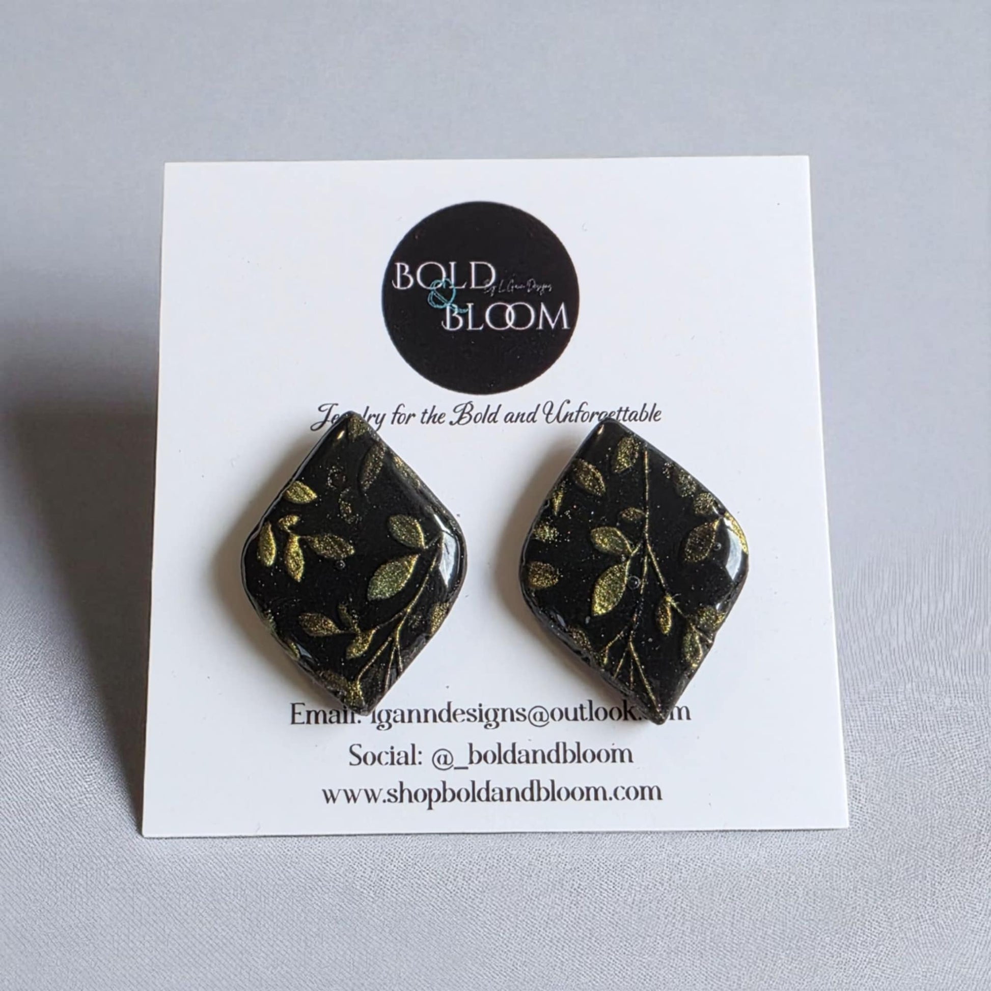 A touch of nature’s magic, captured in a sleek modern silhouette. These diamond-shaped studs feature delicate trailing vines embossed across a shimmering polymer clay base, sealed with a glossy finish for lasting shine. Elegant yet effortless, they’re the perfect everyday statement earring.