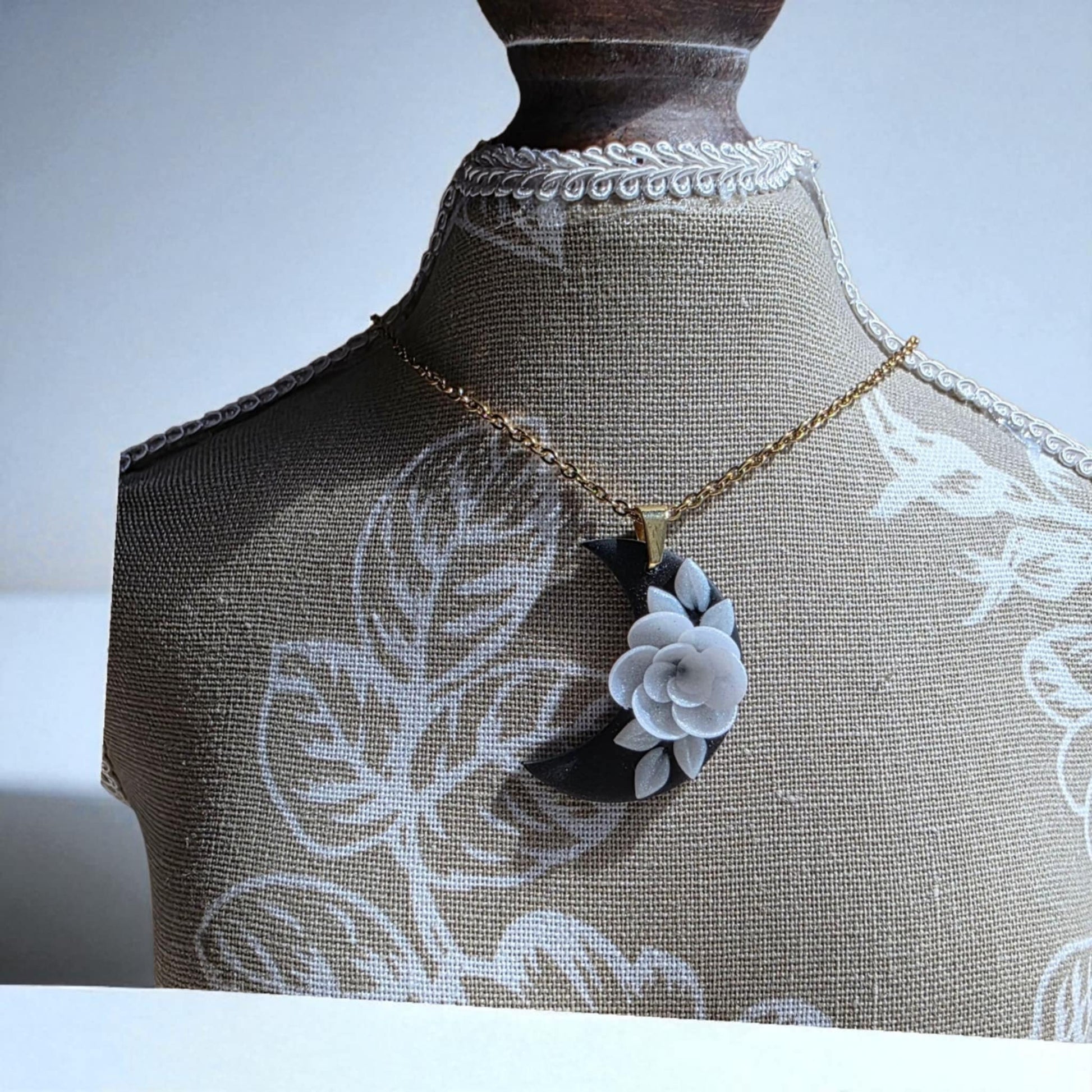 The Lunar Blossom Necklace is a perfect blend of celestial mystery and timeless elegance. Sculpted in a dramatic black crescent moon shape, with a silvery-white flower and shimmering leaves that catch the light like stardust. Bold yet graceful, this necklace brings a touch of lunar magic to both everyday wear and special occasions. Available with silver or gold findings for your perfect finish.