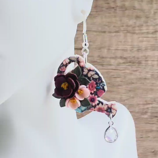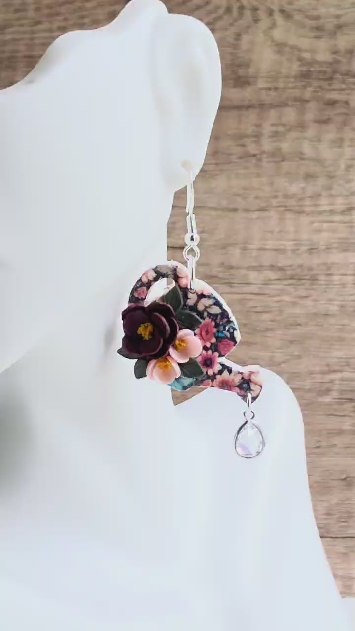 The Midnight Bloom Watering Can Earrings blend dark romance with whimsical charm. Shaped like vintage-style watering cans, each earring features a floral transfer pattern and is topped with deep burgundy and blush sculpted blooms, complete with lifelike leaves and golden centers. A single crystal raindrop dangles from the spout, adding just the right touch of sparkle.