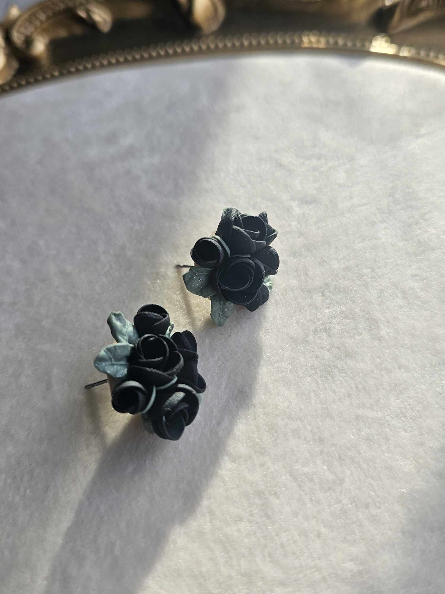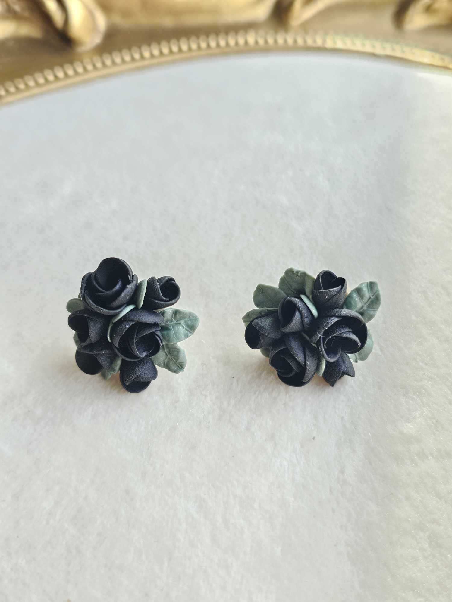 Beautiful handcrafted design that's bold yet romantic, the Midnight Garden Studs are a statement in quiet rebellion. Each earring features a hand-sculpted bouquet of black rosebuds, arranged in an intricate cluster and accented with sage green leaves. With their matte finish and dramatic silhouette, these clay studs channel mystery, strength, and elegance in one unforgettable pair.