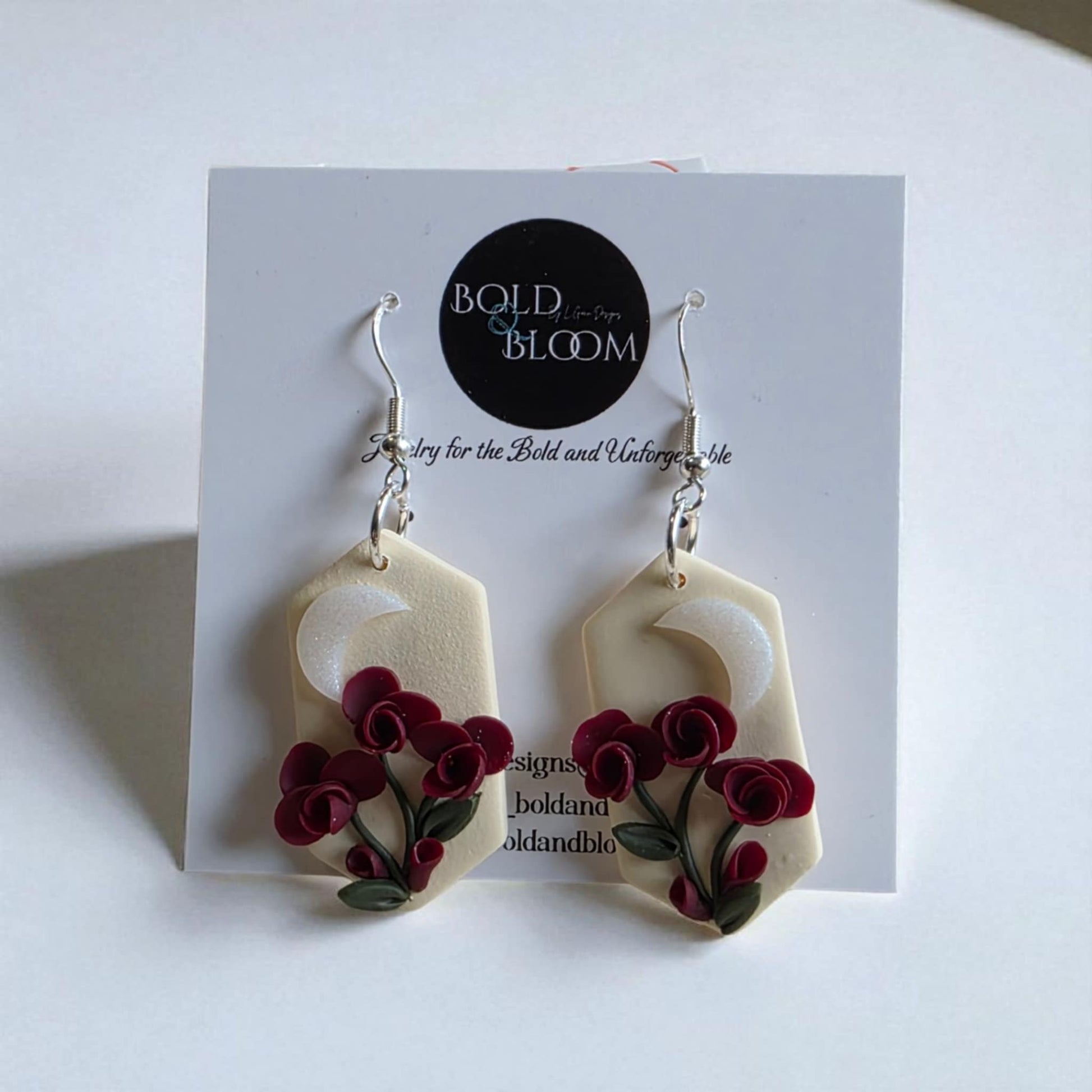 The Crescent Bloom Earrings capture the quiet magic of nightfall. Handcrafted in ivory clay, each earring showcases a shimmering crescent moon rising above deep burgundy blossoms and lush green leaves. Their elegant silhouette and lightweight design make them a striking yet wearable statement piece—perfect for those who love a touch of celestial romance in their style. Available with silver or gold findings to match your mood.