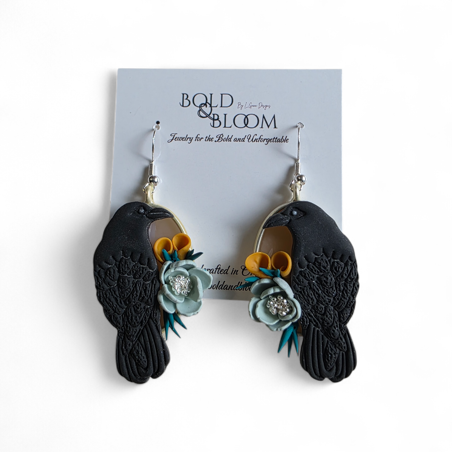 Ravens symbolize intuition, wisdom, and protection. Paired with calm, muted florals, these earrings are designed for those who carry their power with subtle confidence—rooted, observant, and deeply self-aware.