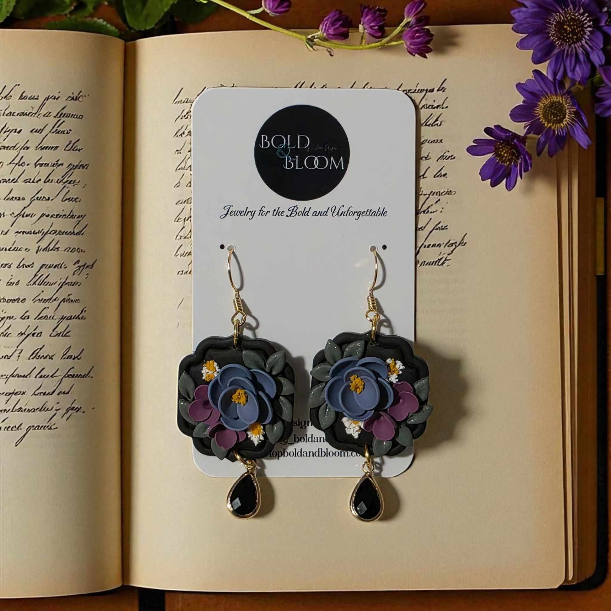 Mysterious and enchanting, the Shadow Bloom Earrings are a tribute to beauty that thrives in the dark. Hand-sculpted florals in slate blue and plum are layered with lifelike greenery and golden accents, creating depth and drama. Finished with a bold black teardrop dangle, these earrings are a statement of strength, elegance, and untamed romance. Lightweight, hypoallergenic, and unforgettable—just like the women who wear them.